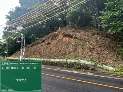 今回は準備工である支障木の伐採、除草作業を行いました。法面の付近に電線が通っており交通量の激しい箇所での難しい作業となりましたが、チルホール等を併用し安全に作業を行うことが出来ました。