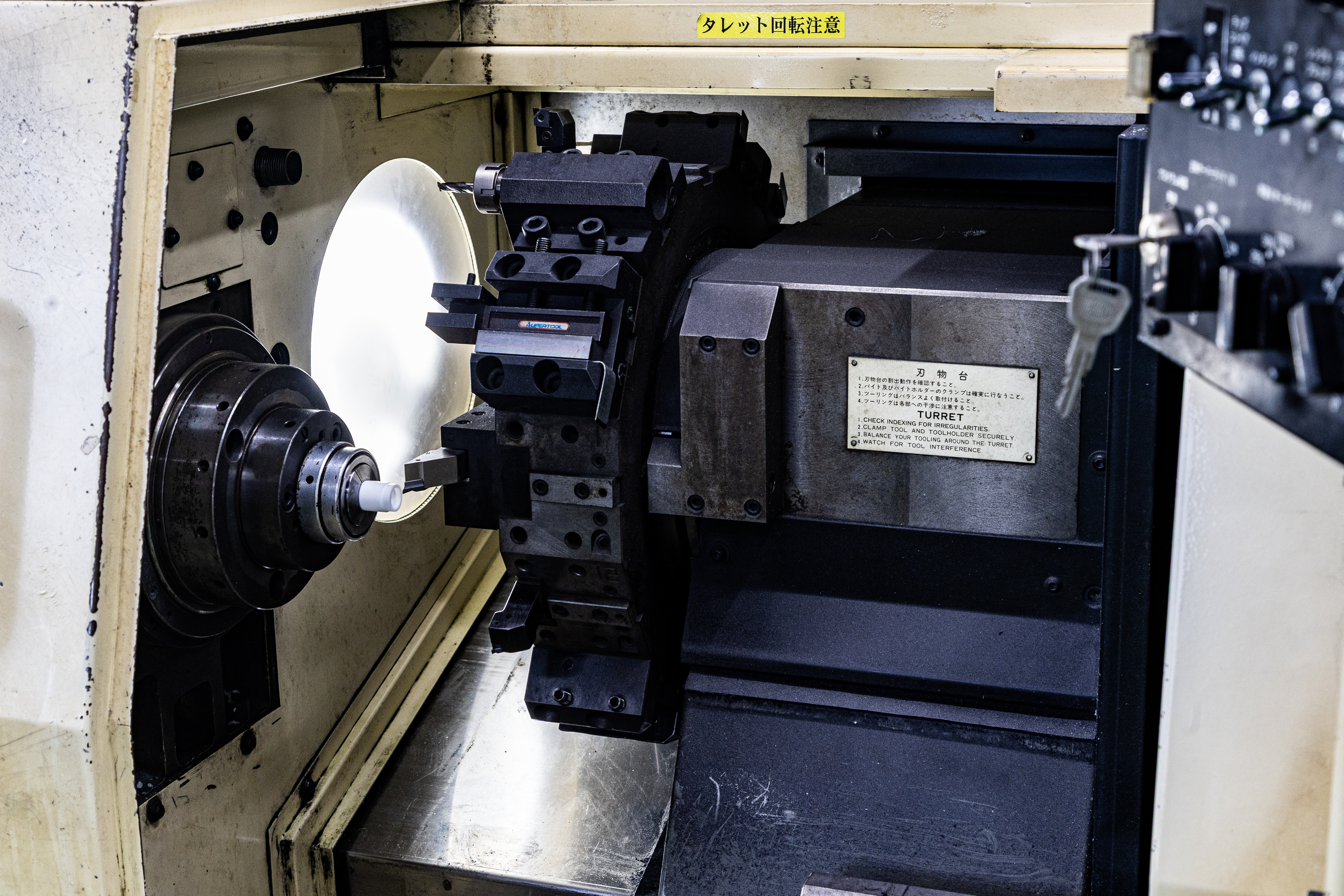 ワシノJ5は、FANUC制御と多角タレットを組み合わせ、汎用旋盤ながら段取り効率と生産性を高い水準で両立。中空チャックによる自動化適性も備えた現場重視の一台です。